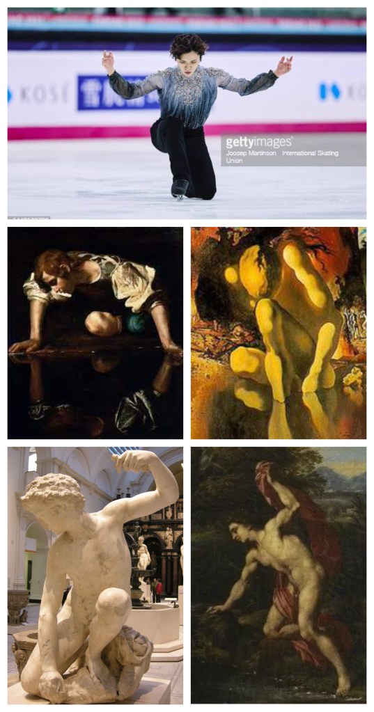 But what do the starting and the final positions ‘mean’? Are there any iconographic parallels (for instance, in the painting or sculpture) that can potentially help us to decode those meanings, or at least draw any specific analogies? Perhaps there are, even if unintentional. The positioning of the skater, particularly at the beginning, as well as the direction of his gaze, has always reminded me of… Narcissus. More specifically, of Narcissus kneeling in front of the spring/pond and falling in love with his own reflection.